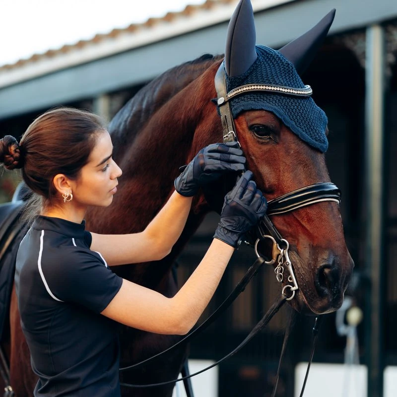 The B Vertigo Laurel ear net is made from delicate crochet. Elastic ears and trim are designed in soft colors that can easily be incorporated into your tack.
