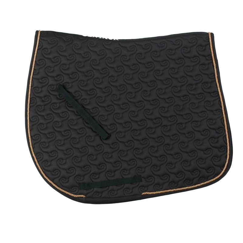 Designed with helix swirl quilting, the Sovereign Dressage Pad is not only eye-catching but comfortable for your horse. Made with a cotton shell, lining with 300-gram polyester, and 15mm foam fill. Coordinating trim and rope. Dimensions are 24 3/4-inch wide x 23-inch spine x 19 1/4-inch deep.