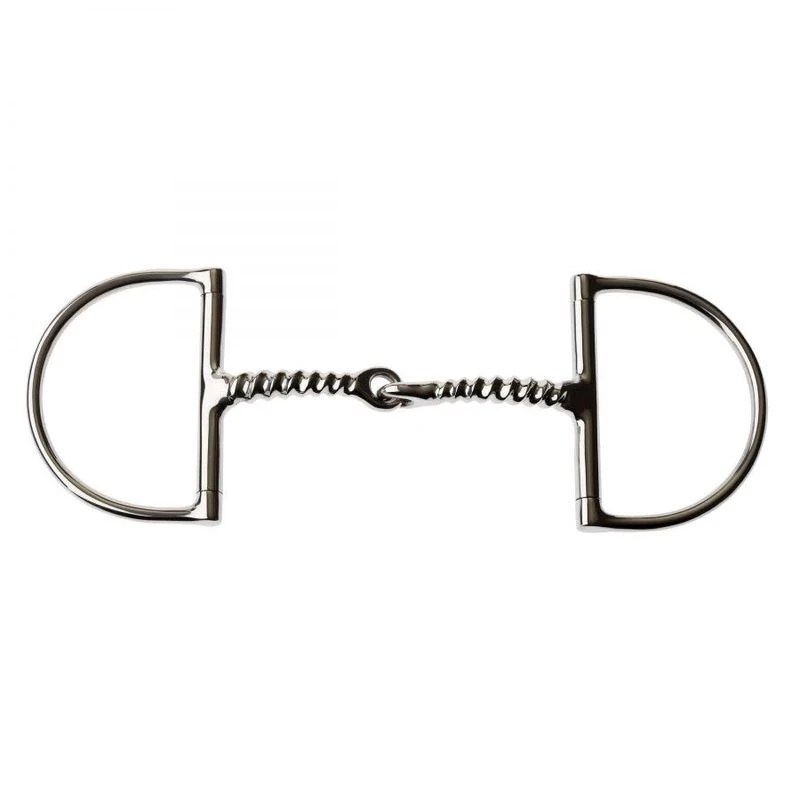The Dee ring compromises between an eggbutt and a full cheek snaffle, preventing pinching at the corners of the mouth and without the dangers posed by the arms of a full cheek snaffle. The corkscrew design puts pressure on the tongue, bars, lips and palate, offering more control over stronger horses.