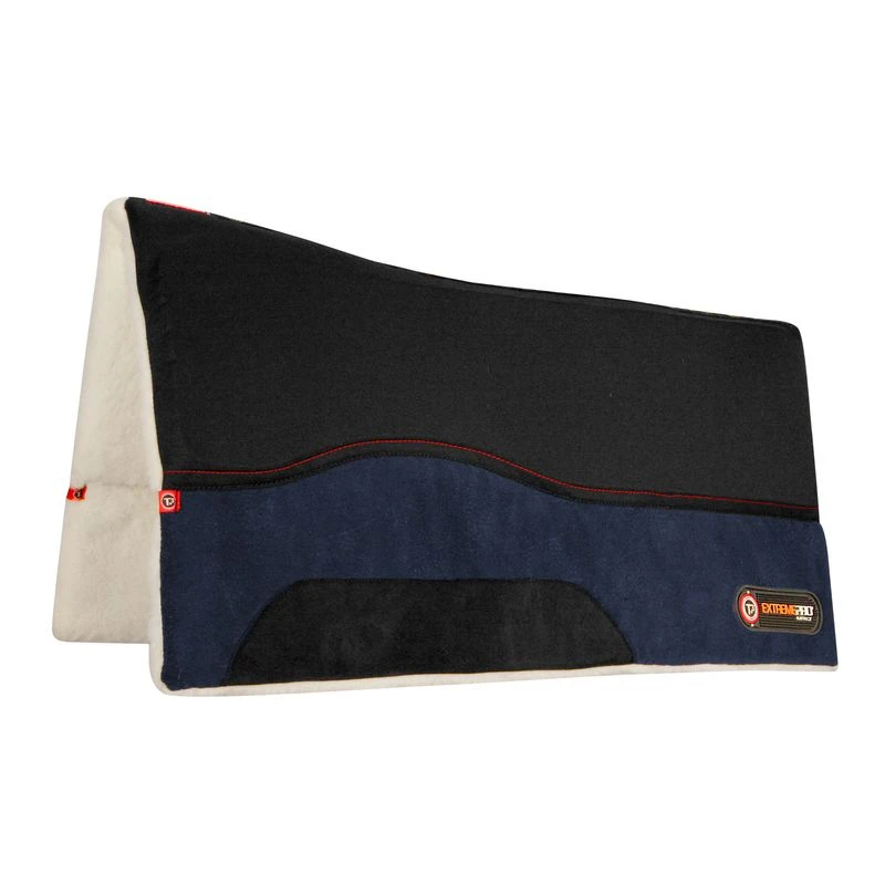 This saddle pad features full length Extreme Pro Impact inserts that cushion, protect, and absorb 90% of the energy transferred between horse and rider. It as rugged non-slip military-grade fabric topper with an attractive MicroSuede pattern below the skirt of the saddle for a traditional ranch pad look. It is lined with WoolBack, 100% natural virgin wool. There is a high profile for maximum wither clearance and correctly placed leg cut outs for leg position.