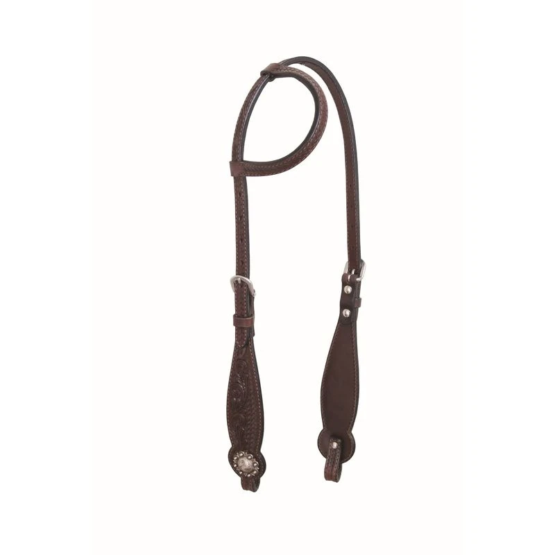 Quality and Style come together in a stunning look you’ll love for this one ear headstall with antique floral tooling combined with basket tooling and complemented by Berri Conchos.